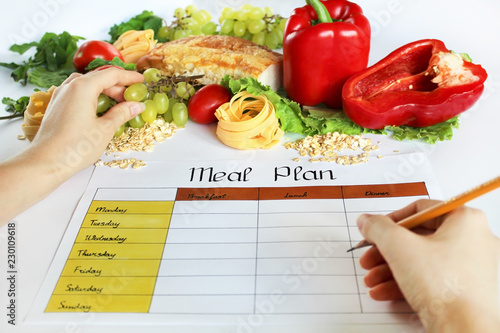 A Meal Plan For A Week On A White Table Among Products For Cooking