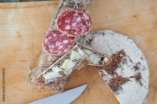 Salami With Butter Bread To Eat On A Wooden Board Stock Photo And